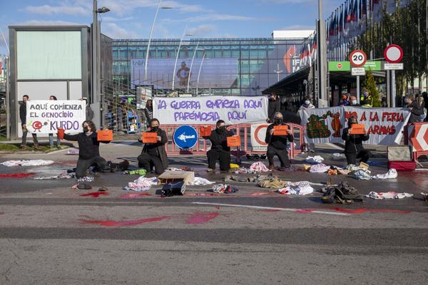 Peluches, biberones, billetes o prendas de ropa ensangrentadas arrojadas por los activistas a las puertas de la Feria han escenificado las guerras y las migraciones forzadas que generan masas de personas refugiadas en las fronteras de los mismos países que hacen negocio con la guerra. Además, el grupo de activistas ha representado en silencio diferentes situaciones de dolor causadas por las guerras y desplegado pancartas tanto en contra de la celebración de la feria como en las que se podía leer “La guerra empieza aquí, parémosla aquí”, mensaje que, según explican, “sirve para recordar que España es el séptimo exportador de armas del mundo, y que esto se logra, entre otras formas, gracias a ferias como esta”.