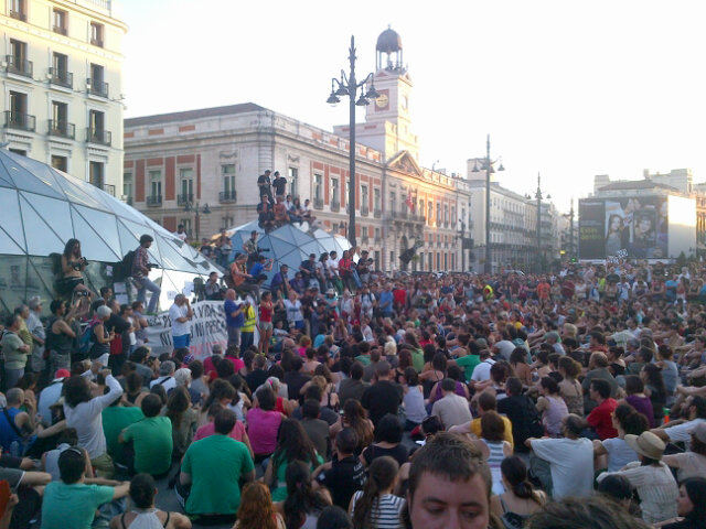 La multitud marchó al sonido de tambores y trompetas y se detuvo en la Puerta del Sol, donde se habían manifestado miles de personas el jueves por la noche, en una masiva protesta que finalmente fue dispersada violentamente por la policía, que disparó balas de goma contra la multitud.