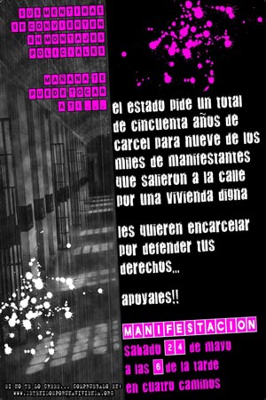 Un movimiento social que tras dos años de existencia ha llevado a cabo numerosas movilizaciones y acciones, logrando incluir en su agenda política una temática que afecta a la mayoría de la población, pero de la que nadie hasta el momento se había hecho eco. Quizás por esa misma razón, porque se ha metido el dedo en la llaga en una problemática que “no convenía” tocar, la respuesta por parte de delegación del gobierno y ahora de la fiscalía es profundamente represiva. Se ha sacado a relucir la contradicción entre un modelo de crecimiento basado en el ladrillo y los intereses de millones de personas que tienen que hacer malabares para llegar a fin de mes.