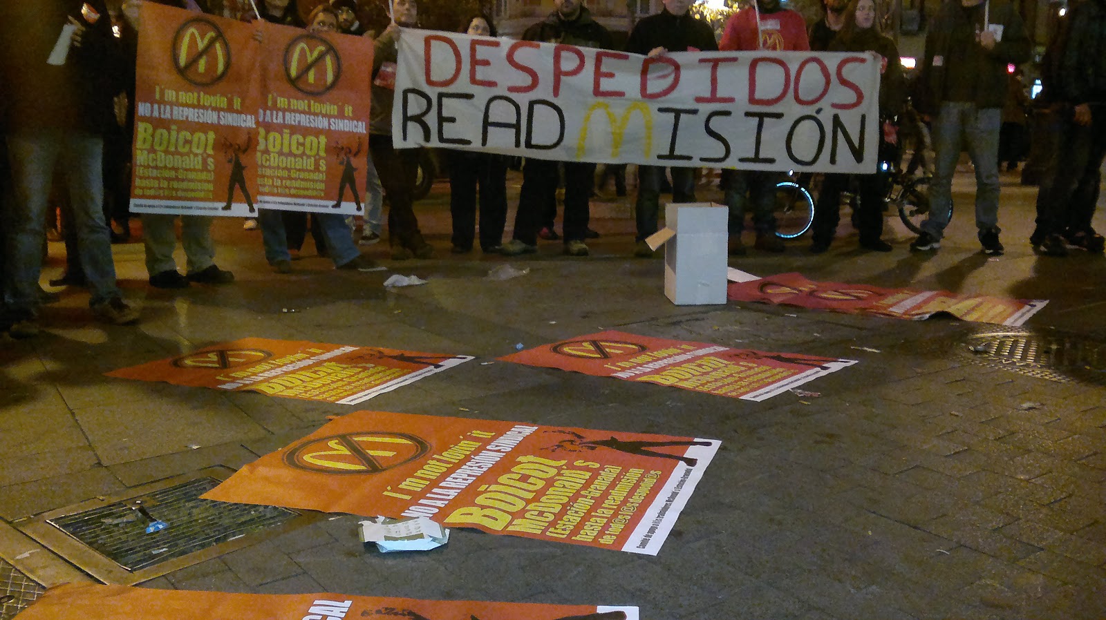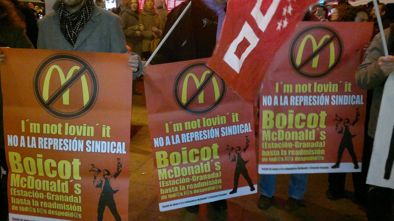 Este viernes unas 50 personas nos hemos concentrado delante del Mc Donald´s situado en la Gran Vía de Madrid en solidaridad Alex, trabajador despedido por su labor sindical en uno de los McDonald´s de Granada.