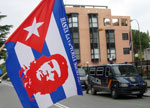 Hoy se ha desarrollado una concentración a las 12 del mediodía frente a la embajada de Cuba en Madrid. Se han colocado dos pancartas en la barandilla de la acera, una de ellas con el lema "Basta de agresiones imperialistas", firmada por CESC, y la otra con "Libertad para los Cionco cubanos presos en EE.UU. por luchar contra el terrorismo", firmada por el comité estatal por la Libertad de los Cinco. [Fotos La Plataforma]