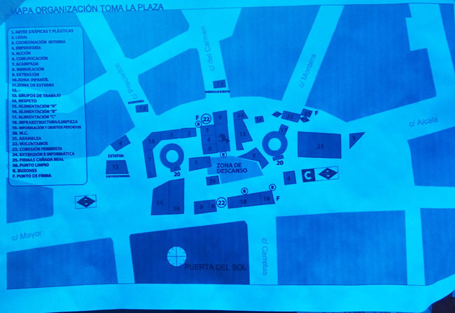 Al principio de todo Comunicación estaba cerca del oso y del madroño, pero luego se desplazó al lugar actual, quién lo decidió? por qué motivo? Nadie ha sabido contestarme. Este diseño organizativo de las carpas significa que cuando "organizaron" el campamento aquellos indignados espontáneos y no tenían ni generadores ni megafonía, ya sabían que debían montar el centro de mando junto a la estatua por la seguridad que da poder tener un soporte para enganchar la antena en un punto alto, protegida por las rejas, rejas que, a su vez, protegen los generadores y la megafonía en su interior. Hay que ver nuestra juventud lo que vale.