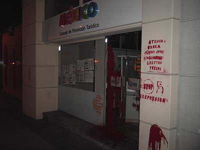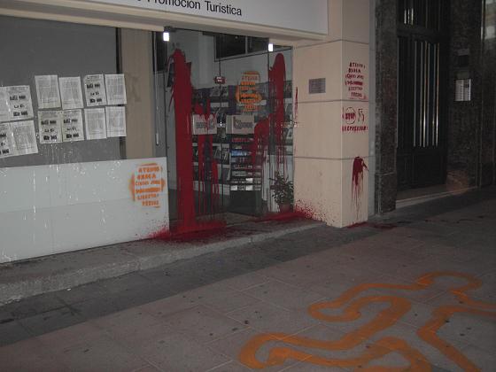 La acción consistió en bloquear la puerta atascando la cerradura dejándola inservible. Así mismo se colgaron carteles informativos sobre la situación de México y el por qué de la acción. Se dibujo en la acera, frente al establecimiento, la silueta de una persona muerta como hecho simbólico de todos los asesinad*s, torturad*s y pres*s en México en los últimos meses. Además se roció el escaparate de pintura roja en representación de la sangre que esta derramando el estado mexicano al reprimir a los revolucionari*s que luchan contra los pilares donde se sustenta el sistema: la propiedad y la acumulación de capital. También se hicieron pintadas exigiendo la libertad de los presos políticos mexicanos.