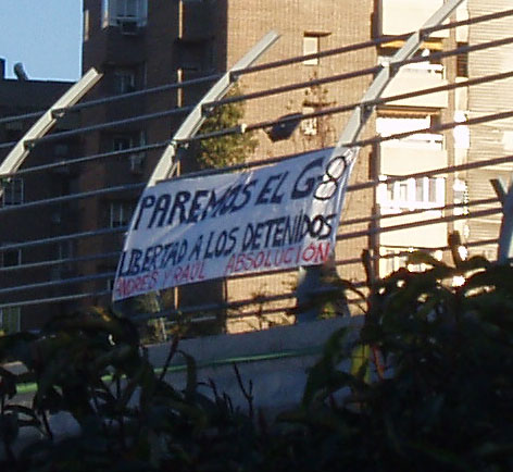 En solidaridad con los detenidos del g8 2007 Andrés y Raúl que ayer 7 de noviembre tenían el juicio en Alemania, se desplegaron pancartas en distintos puentes sobre las carreteras de Madrid.
