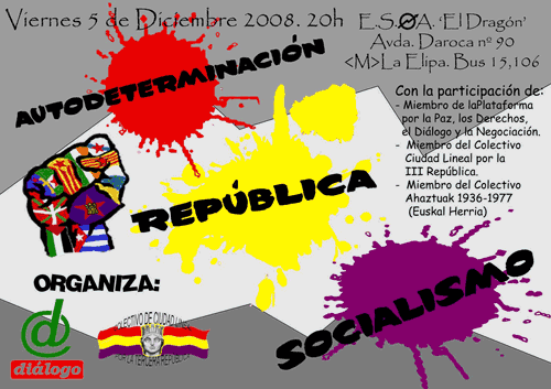 Por todo esto te invitamos al acto “Autodeterminación, República y Socialismo” que tendrá lugar a las 20 horas en el E.S.O.A. El Dragón (Avda. Daroca nº 90, en la puerta principal del cementerio de la Almudena, Metro La Elipa) el Viernes 5 de Diciembre y te convocamos a participar en la MANIFESTACIÓN contra la constitución de 1978 el sábado 6 de Diciembre a las 12:00 de Cibeles a Sol.