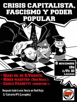 En el marco de las Jornadas de la Coordinadora Antifascista, Red Roja organiza el Acto público que lleva por título "Crisis capitalista, fascismo y poder popular", en el que intervendrán Carlo Frabetti, Iñaki Gil de S. Vicente y Ángeles Maestro. Tendrá lugar el viernes 8 de noviembre, a las 19h en c/ Fe nº 10. Metro Lavapiés.