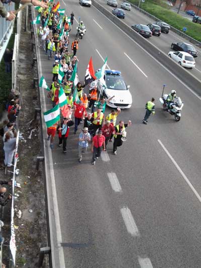 Militantes del Bloque Juvenil, sindicalistas de CGT y otros activistas de distintas ideologías están recibiendo a la columna Sur del SAT en su entrada a Getafe con gritos de "Viva la lucha de la clase obrera" y con bengalas.