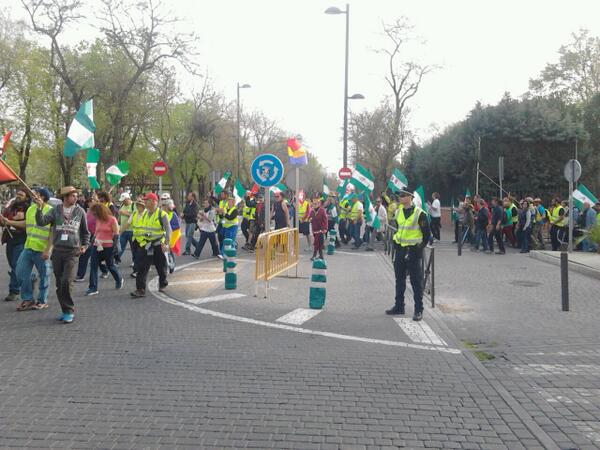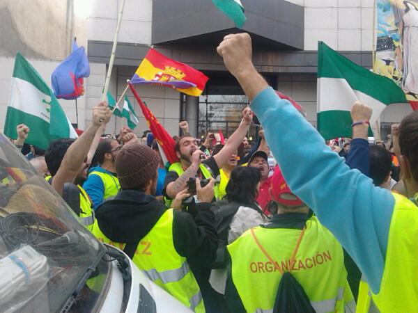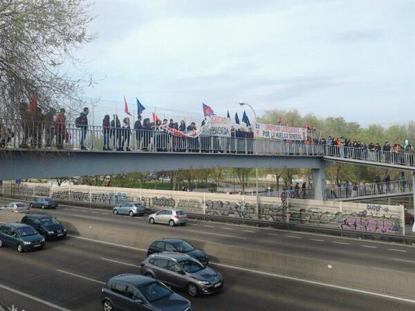 Actualizado 17.30 Militantes del Bloque Juvenil, sindicalistas de CGT y otros activistas de distintas ideologías están recibiendo a la columna Sur del SAT en su entrada a Getafe con gritos de "Viva la lucha de la clase obrera" y con bengalas.