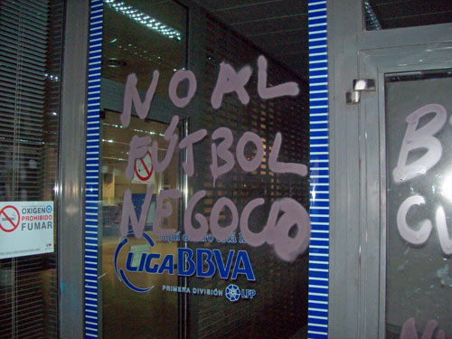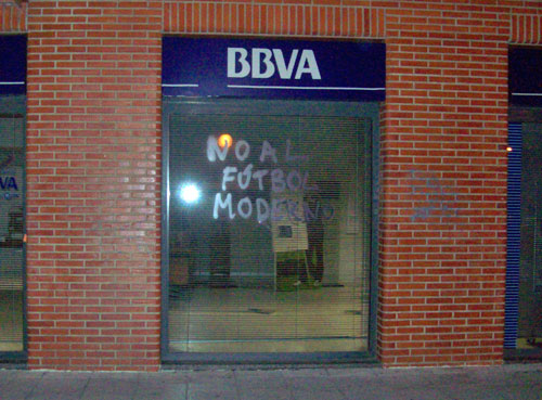Arrancamos las III Jornadas contra la Ley del Deporte y la represión con esta acción que señala directamente uno de los mayores problemas que sufrimos los que amamos este deporte, y ese no es otro que el fútbol-negocio. El blanco elegido, distintas sedes del BBVA, no es casual, sino que responde al ataque a una entidad que, como tantas otras, está convirtiendo nuestro fútbol en un mero negocio. Se ha llegado al extremo de cambiar los nombres de nuestros estadios o de nuestros equipos por los de empresas y multinacionales, o incluso el de nuestras competiciones: la Primera División de toda la vida ha pasado a llamarse Liga BBVA y la Segunda, Liga Adelante. Así, por toda la cara, sin tener en cuenta la opinión de los que de verdad queremos y defendemos este deporte.
