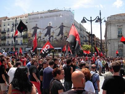 La manifestación transcurrió sin incidentes reseñables hasta la Puerta del Sol. Allí, Carmen, secretaria de la Confederación Regional Centro, cogió el micrófono y en un mitin claro y directo denunció el nuevo golpe a la clase obrera que supone la reforma laboral, donde los propios trabajadores cotizan para pagarse un fondo de donde se cogerá el dinero para pagar su propio despido, por no hablar del abaratamiento de este, etc. Denunció una crisis que recae en los trabajadores frente al capital que sale reforzado por los gobiernos, y habló de la necesidad de luchar con más fuerza que nunca para plantar cara a los enemigos de la clase obrera. Poco después Velasco, de la Federación Local de CNT-Madrid, denunció el fracaso del capitalismo, que sólo funciona para unos pocos sosteniéndose sobre la explotación de la gran mayoría de los seres humanos. Advirtió además que nada podemos esperar de quien gobierna, pues estamos en manos de empresarios corruptos, políticos corruptos y sindicatos corruptos de cuyas manos ha salido la última reforma laboral. Aludió al pensamiento único que nos hace creer que las medidas que se toman para solucionar los supuestos problemas económicos, es decir, las neoliberales, son las únicas posibles. Así señaló el fracaso de los proyectos políticos reformistas, que además de fallar como proyectos políticos, también han fracasado como proyectos morales. Frente a esto sólo queda la dignidad de la lucha por la justicia social, que en última instancia debe tomar forma en el comunismo libertario, un sistema hecho por los hombres y mujeres para ellos/as mismos/as y no contra ellos/as (para erradicar así la explotación del hombre por el hombre). Un sistema que se construye antes que nada sobre el humanismo revolucionario de la fraternidad y el apoyo mutuo.