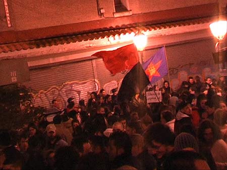 21.10: Hay dos pancartas, la de la Coordinadora Antifascista que dice "No al terrorismo fascista" y la de la Asamblea Ciudadana de Malasaña que pone "Fuera fascismo del barrio". Hay también una bandera castellana y una roja y negra. La policía sigue en actitud tranquila. Como se sabe, el 1 de marzo de 2006, durante la representación del espectáculo de la tarde, se encontró dentro del teatro Alfil de Madrid un artefacto explosivo, ya activado, con una mecha de efecto retardado encendida, de aproximadamente una hora de duración, para que estallara durante la función de Leo Bassi.