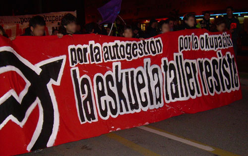 21.15: La manifestación se ha desconvocado tras leer un comunicado en el que se ha denunciado a las autoridades por las amenazas de desalojo vertidas sobre el CSO Eskuela Taller. Se ha realizado una reivindicación de la okupación como instrumento de lucha y se ha finalizado coreando gritos de "Un desalojo, otra okupación". También se lanzaron cohetes al aire. Por último, se ha invitado a todos los presentes a la fiesta que tendrá lugar dentro del centro social (fiesta a la cual han excluido expresamente "a los maderos y a los secretas"). [Fotos: La Plataforma]