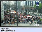 18.45: Ha arrancado la marcha, la cabecera va por la Comisión del Mercado de las Telecomunicaciones y la cola no ha abandonado Cibeles, se puede calcular que hay unas 3500 personas. El ambiente es bastante festivo, se han sumado dos camiones con música y el grupo de Samba Revolucionaria Repercusión se ha incoporporado a la manifestación. Hay gran cantidad de furgonas de antidisturbios, al menos 3 en la cabecera y 6 cerrando la marcha, pero en actitud tranquila.