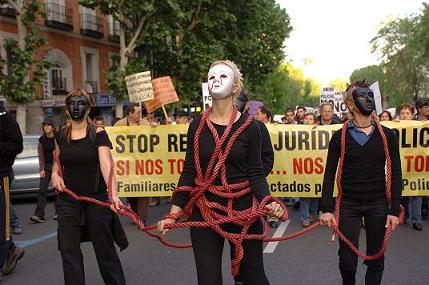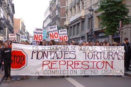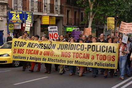 La manifestación partió hacia la puerta del Sol encabezada por una pancarta en la que se podía leer "stop represión-stop montajes-en democracia se goza de libertad a cambio de no usarla", y unos metros mas atrás seguían la marcha los padres y madres de afectadxs por montajes policiales y jurídicos, tras una pancarta en la que se podía leer "si nos tocan a unx nos tocan a todxs". Aparte de estas pancartas decenas de pancartas y carteles se visivilizaban a lo largo de la multitudinaria marcha, en un ambiente tranquilo y combativo donde no se dejó en ningún momento de corear consignas como "la policía tortura y asesina" "aquí se tortura como en la dictadura" "abajo los muros de las prisiones", tambien un grupo de compañeras estuvo liándola durante todo el recorrido, parodiando y escenificando las "miserias"del cuerpo "nasional" de "polisía".
