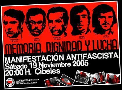 Por eso hoy, en esta movilización del 20N, recordamos a tod@s l@s que se dejaron las ilusiones, la salúd o la vida combatiendo al fascismo, recordamos con especial fuerza y cariño a los cinco luchadores por la libertad que el franquismo asesinó hace treinta años. Nosotr@s, la juventud que lucha, estamos orgullos@s de pertenecer al mismo pueblo que los vió nacer, al mismo pueblo que con las armas en la mano defendió años antes la libertad y el fin de la explotación, al mismo que cuarenta años de dictadura terrorista no lograron callar, al que hoy reivindica a tod@s l@s que han caído: 200.000 fusilad@s y cerca de un millón de pres@s polític@s.