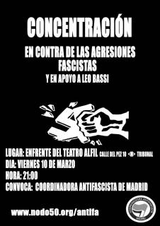 Por todo esto convocamos el viernes 10 de marzo una concentración en contra de los ataques a la representación de la obra teatral "La Revelación" y las agresiones fáscistas. A las 21:00h de la noche en el Teatro Alfil (Calle del Pez nº 10, metros Tribunal y Noviciado).