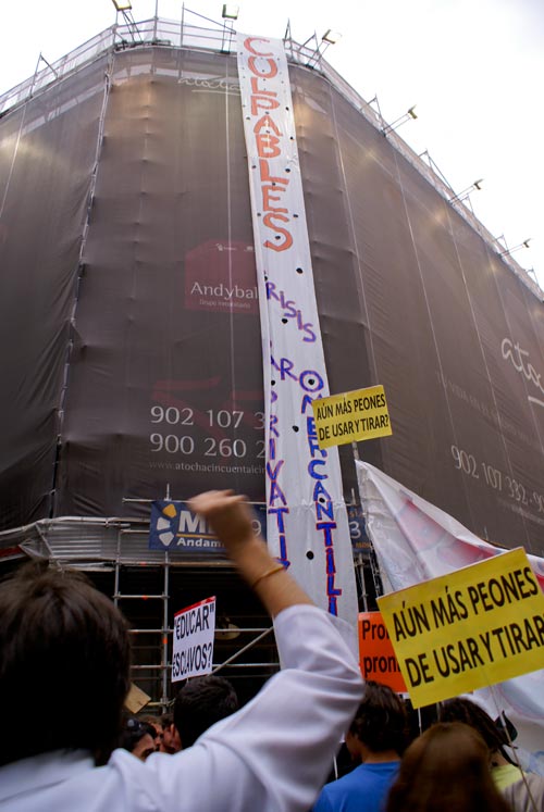 Se continuaba por la calle Atocha y a la altura de Antón Martín, los payasos comienzan a jugar con la policía en una calle aledaña, un gran grupo de manifestantes se acerca a la zona y los antidisturbios van detrás. En ese momento una pancarta gigante comienza a caer desde la azotea en el 6º piso del edificio en cuyo bajo contiene una sede del Banco Santander. En ella se leía “CULPABLES, CRISIS, PARO, MERCANTILIZACIÓN Y PRIVATIZACIÓN”. La manifestación se anima y comienza a corear “O no Bolonia no, Bolonia No” y a gritar “Somos estudiantes, no delincuentes”. Ninguna detención y la manifestación continua con más fuerza que nunca hacia a Atocha.