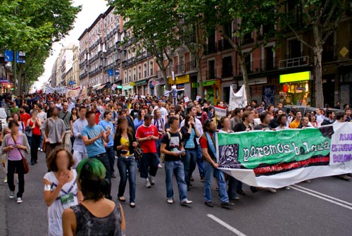 El pasado sábado 9 de mayo, cerca de 5000 personas salieron a la calle bajo el lema “Paremos Bolonia, contra la corriente privatizadora y mercantilizadora.” Desde el comienzo de la manifestación, una gran presencia policial rodeaba la zona e identificaba a un grupo de compañeras en el metro. El helicóptero sobrevolaba la zona. Parece que la policía estaba al tanto de la prohibición de la delegación de gobierno de que el recorrido pasase frente a sanidad. La colocación de los cascos antidisturbios hace pensar que esperaban estudiantes cabreadas…También podría ser que la delegación notificase al mando, que la manifestación empezaba 2 horas antes “por error”.
