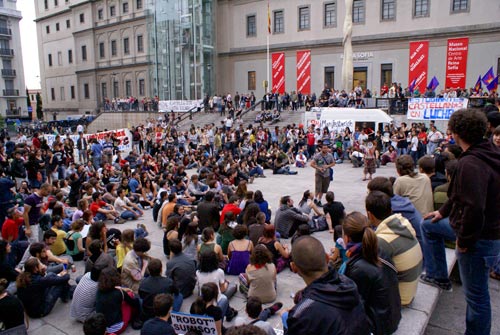 Allí 3 filas de antidisturbios esperaban a los manifestantes… ¿creerían que se iba a ir al ministerio de Sanidad?¿No se les informó del cambio de recorrido? La manifestación se desvió delante de ellos hacia la Plaza del Reina Sofía. Allí les esperaban unas charlas sobre urbanismo y los detenidos en las últimas movilizaciones por la vivienda digna, sobre sanidad, sobre medio ambiente y sobre la educación. Tras ser desconvocada la manifestación, las clases populares daban comienzo, con pizarra incluida, en plena calle ante la mirada atónita de las transeúntes.