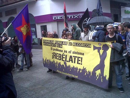 Alrededor de 500 personas de la zona sur de Madrid, especialmente Alcorcón, pero también de Móstoles, Leganés y Villaverde, han acudido a la manifestación del 1º de Mayo, que este año se ha decidido convocar en el pueblo de Alcorcón desde diferentes sindicatos, organizaciones políticas y colectivos que trabajan a lo largo del año en el barrio. Han apoyado y convocado esta convocatoria La Encrucijada, el CSO La Escuela Taller, el SAS -Sindicato Asambleario de Sanidad-, el Colectivo La Revoltosa, el CSO La Casika, la CNT Comarcal Sur, Solidaridad Obrera, la Coordinadora de Asambleas Obreras del Sur, Izquierda Castellana y las Asambleas Populares del 15M de Móstoles, Leganés y Alcorcón, que han aprovechado la ocasión para distribuir el primer número de su publicación escrita (Agora).