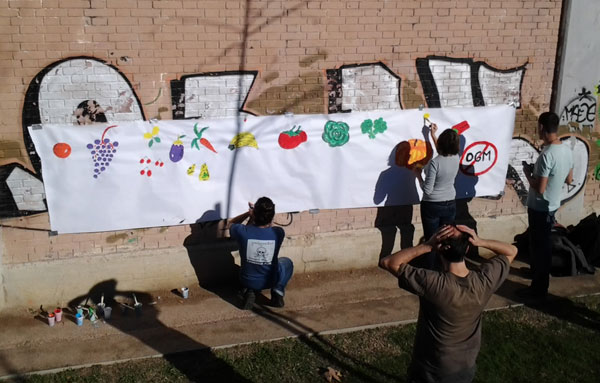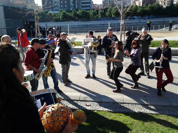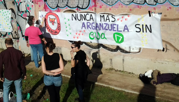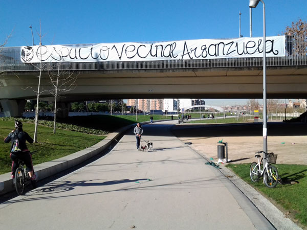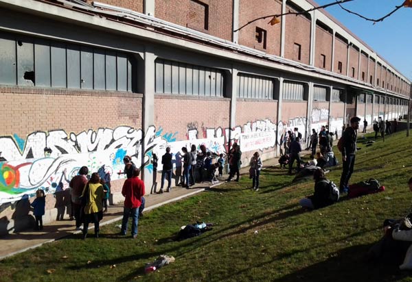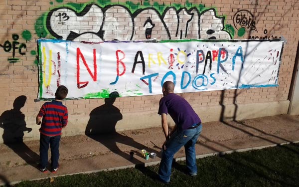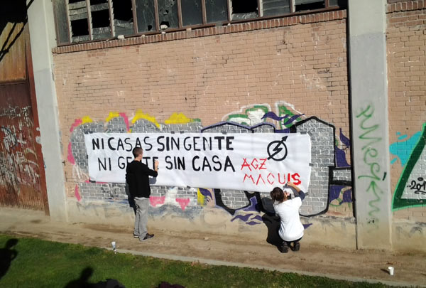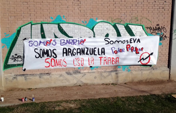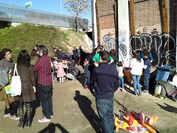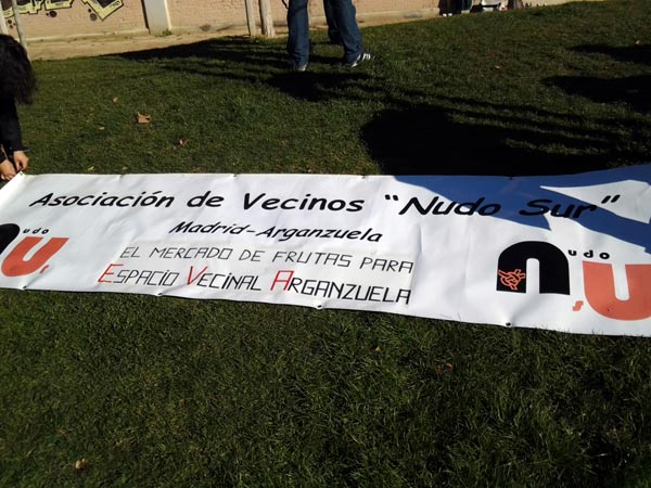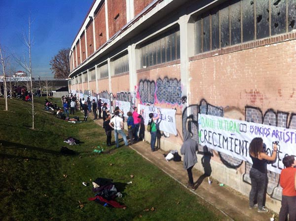 Convocados por el Espacio Vecinal Arganzuela, decenas de colectivos se reunieron el pasado sábado 20 de diciembre para decorar con mensajes reivindicativos una de las paredes del antiguo mercado de frutas y verduras de Legazpi, de 40.000 metros cuadrados y que llevan años abandonado. Es su manera de reivindicar para el barrio, tras la demolición por sorpresa del CSO La Traba el pasado mes de agosto, un espacio que pueda ser autogestionado por las asociaciones y colectivos sociales de Arganzuela.