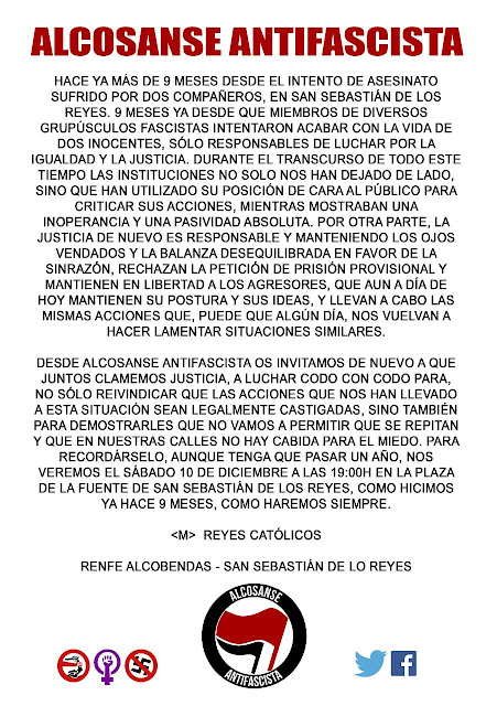 Desde Alcosanse Antifascista denuncian la "pasividad de las instituciones en cuanto a los apuñalamientos ocurridos en marzo en San Sebastián de los Reyes por parte de nazis locales a dos compañeros antifascistas". Los hechos ocurrieron el 4 de marzo cuando un conocido neonazi de San Sebastián de los Reyes, Luis Alberto García, apodado “El Fofi”, acompañado de otros 5 neonazis atacaron armados con navajas a dos jóvenes del barrio.