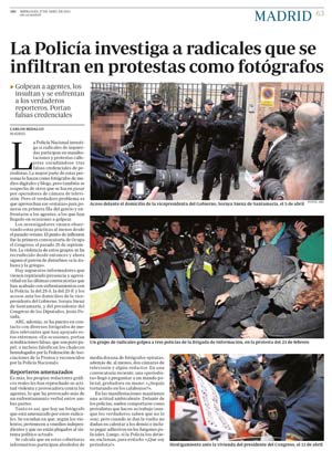 La noticia saltaba este mediodía a la red a través de sus compañeros de profesión. Raúl Capin había sido detenido en su domicilio por la policía nacional acusado de varios delitos relacionados con su trabajo en las pasadas manifestaciones del 23F y el 25A en Madrid. El fotoperiodista freelance colaboraba asiduamente con Mundo Obrero y Diario Digital Independiente. Seguidamente se ampliaba la noticia con una nueva detención, Adolfo Luján también periodista y compañero de Raúl. Segun informa la prensa oficial citando fuentes policiales, la acusación se refiere a un momento de dichas manifestaciones donde varios agentes de paisano de la Brigada de Información practicaban unas detenciones. Para Adolfo se suma la acusación de divulgar en las redes sociales "que los policías de paisano lanzan objetos y provocan actos violentos". Según ha explicado su abogado Rafael Mayoral, les han tomado declaración a mitad de la tarde y lo más probable es que pasen la noche en dependencias policiales. ABC señala a 'periodistas violentos' El diario ABC publicaba el pasado 17 de abril en su edición en papel un articulo donde señalaba que en las manifestaciones había grupos de falsos periodistas que se ocupaban de alentar la violencia de los manifestantes y agredir a los agentes de policía. Carlos Hidalgo, el redactor de ABC que publicó esta información dice en su articulo "Hay supuestos informadores que vienen repitiendo presencia y agresividad en las últimas convocatorias que han acabado con enfrentamientos con la policía". El mismo redactor acusaba a estos supuestos falsos fotoperiodistas de que "en las manifestaciones mantienen una actitud ambivalente. Delante de los policías, suelen comportarse como periodistas que hacen su trabajo (aunque los verdaderos saben que no lo son), pero cuando se dan la vuelta no dudan en calentar a los demás". La noticia en cuestión venía ilustrada por tres fotografías donde aparece Raúl Capin, trabajando y en ocasiones siendo empujado por la policía. Raúl Capin enseña su acreditación y es robada por la policía