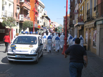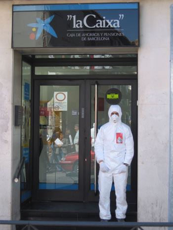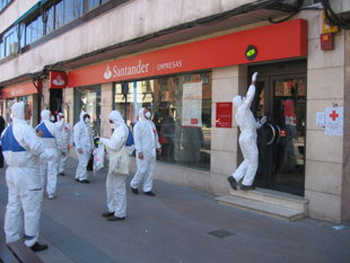 El virus ha sido identificado y marcado como zona de peligro con puntos negros… A lo largo de la Calle Madrid, en pleno centro comercial y financiero de Getafe, un colectivo de trabajadores, jubilados y AA.VV. , así como afiliados a la CGT, hartos ya de sufrir la crisis y sus consecuencias han actuado a favor de lo que tiene que ser una lucha por el comienzo de un futuro menos incierto que el que sufrimos actualmente. Bancos y Cajas han sido marcadas para escarnio público.