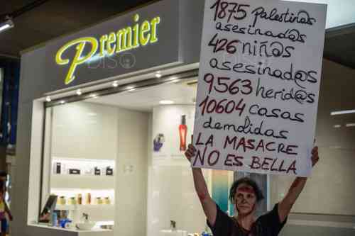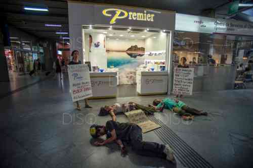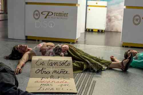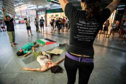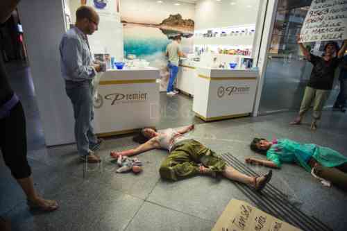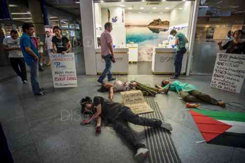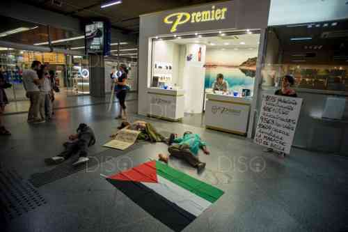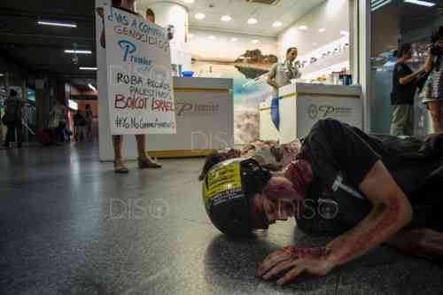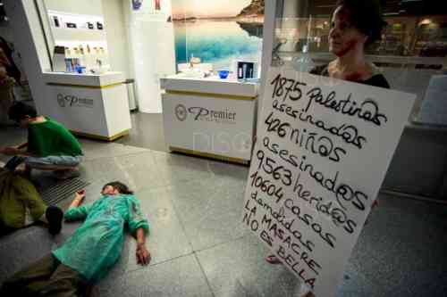 Madrid, 6 de agosto de 2014. Un grupo de activistas del movimiento BDS (Boicot, Desinversiones y Sanciones contra la ocupación israelí) han protagonizado una performance frente a la tienda de cosméticos Premier de la Estación de Atocha, una cadena que comercializa en España productos fabricados en los territorios ocupados de Palestina pero etiquetados como israelís.