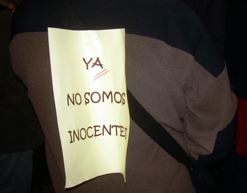 Bajo el Lema "Hemos perdido la inocencia", varios miles de personas recorrieron el centro de Madrid desde la Puerta de Alcalá hasta Sol el miércoles 28 de diciembre. La policía intentó impedirla antes de que empezara, con el resultado de dos detenidos y un contusionado.