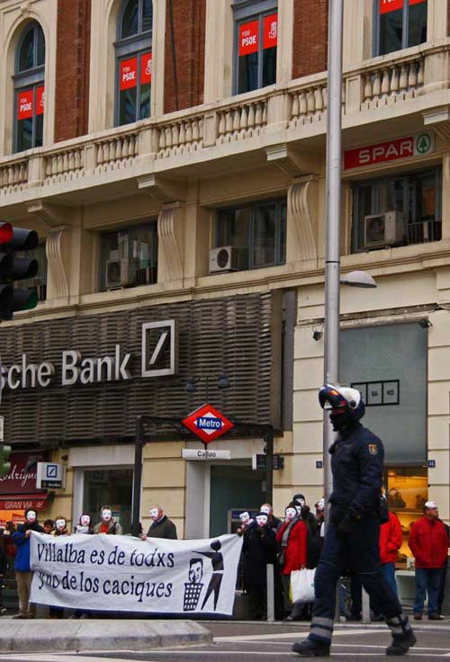 · Por último, el 13 de febrero de 2010, durante la celebración de los carnavales en Collado Villalba, dos participantes en la comparsa de los movimientos sociales fueron obligados a identificarse por la policía local cuando repartían propaganda política, a la vez que fotografiaban y advertían a los portadores de una pancarta crítica con el alcalde, que no dejarían que subieran con ella al escenario, mientras otras comparsas pudieron hacerlo.