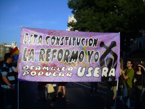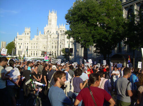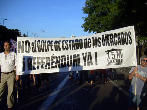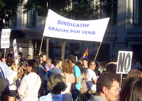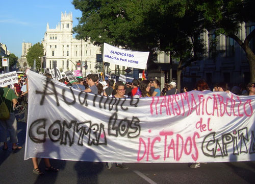 La Asamblea Popular del Barrio de las Letras, apoyada por la Asamblea Popular de Chamberí, convocó en la Asamblea General de Sol a esta manifestación saliendo de Atocha, para unirse luego en Cibeles con la marcha sindical. Los lemas del 15 M eran: ‘No a esta reforma de la constitución. Abajo el orden de los mercados y el capital‘ y ‘Sindicatos, gracias por venir‘. El bloque del 15-M estaba conformado por unas 2000 personas.