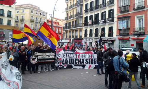 Este domingo 9 de junio una multitud acudió a Tirso de Molina, convocados por la Coordinadora Antifascista de Madrid, para repudiar el asesinato del joven antifascista Clement en París. La concentración se desarrolló sin presión policial y con permanentes cánticos de "Clement, hermano, nosotros no olvidamos", "ni olvido ni perdón" y "Madrid será la tumba del fascismo".