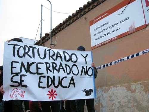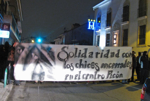 Más de 250 personas marcharon por las calles de Paracuellos del Jarama la tarde del pasado sábado. Lugar donde se encuentra el centro de menores de "Picón de Jarama", propiedad de la Fundación O’Belen. Una pancarta en la que se leia "Solidaridad con lxs chicxs encerradxs en el Centro Picón" abria la manifestación, la cual coreó consignas contra los más que demostrados habituales malos tratos en los centros de menores cerrados. La protesta concluyó frente al centro de "Picón de Jarama" y más tarde grupos de solidarios continuaron frente a una de las sedes de IberCaja, empresa capital de la Fundación O´Belen. La Guardia Civil vigiló la marcha durante todo el recorrido, sin producirse incidente alguno.