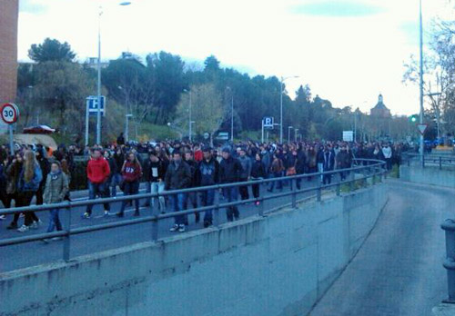 Al concluir una asamblea estudiantil convocada a las 17:30, unas 500 personas comenzaron una manifestación cortando la Avenida Complutense en los dos sentidos en dirección a Moncloa. Por su parte, un dispositivo de 7 furgones de antidisturbios bloqueó la calle con los antidisturbios preparados para cargar, sin embargo la marcha continuó en sentido contrario. Tras una hora de movilización se han disuelto los bloqueos de tráfico y han comenzado los encierros en varias facultades.