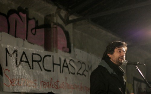 Sobre el escenario, inició las intervenciones Rafa Mayoral, que llamó a la resistencia civil organizada frente a un gobierno que viola sistemáticamente los derechos humanos, recordando que por encima de leyes de “seguridad ciudadana”, el código penal, la ley de enjuiciamiento civil o la propia constitución española está la Carta Universal de los Derechos Humanos. También defendió el Derecho a la Rebelión que consagra este mismo texto, cuando un gobierno antepone la ley a la justicia, convirtiéndose en un régimen despótico. ¡Si se Puede!, repitió en numerosas ocasiones, recordando que hace tiempo era impensable frenar desahucios y hoy se logra gracias a la resistencia civil.