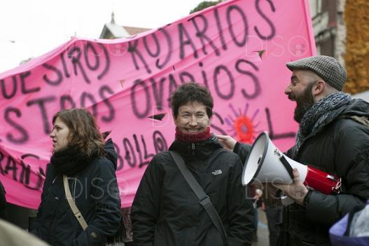 A las 12.20 de la mañana la glorieta de San Bernardo ya aparecía abarrotada y teñida de violeta. Multitud de pancartas rezaban consignas como: “Nosotras decidimos. Aborto Libre”, “¿El embarazo es mío y el aborto de un cura, un psiquiatra y un juez?”, “Aborto libre y gratuito”. O incluso algunas más imaginativas escritas en paraguas o colgadas de perchas decían: “Soy persona no una incubadora” o “Antes de tirar de percha, tiraré de guillotina”.
