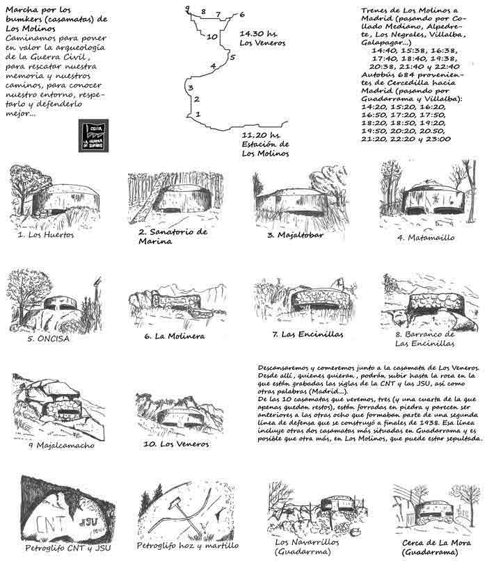 Asistieron un nutrido grupo de jóvenes de La Fábrika, personas y activistas de varios pueblos de la Sierra, gente de la Sociedad Caminera... así como especialistas tan reputados como el catedrático Juan José Castillo y Domingo Pliego, autor de una cincuentena de libros sobre la Sierra de Guadarrama. Junto a las casmatas se dieron explicaciones sobre el desarrollo de la guerra civil en esta zona de la Sierra, se expusieron algunos de los desastres de la especulación en Los Molinos (ONCISA, la enajenación del Sanatorio de Marina, la línea de 400.000 voltios en Guadarrama, etc.) y en un par de momentos, David, medioambientalista, explicó detalles de las formaciones geológicas y de la flora de la Sierra. Creemos que todos/as lo pasamos bien, aprendimos a conocer mejor nuestra Sierra, a reconocer la historia de los que lucharon... y cuando las cosas se conocen mejor se defienden mejor. La acogedora respuesta nos anima a organizar más actividades de este tipo.