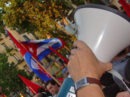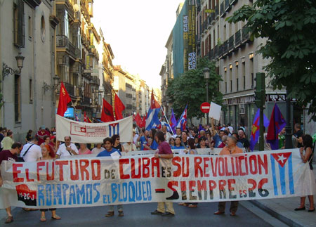 Ayer, jueves 26 de julio, cerca de 500 personas recorrieron la calle Atocha hasta la plaza de Tirso de Molina, conmemorando el asalto al cuartel Moncada en Santiago de Cuba, repudiando el bloqueo imperialista a la isla y en apoyo a la revolución.