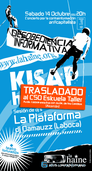Este sábado 14 de Octubre a partir de las 20 hrs tendrá lugar en el Centro Social Okupado Eskuela Taller de Alcorcón, Madrid, un concierto (con varias sorpresas) de apoyo a nuestro-vuestro proyecto de desobediencia informativa, que lleva ya 6 años poniendo en práctica unos principios comunicativos construidos al calor de los movimientos sociales autónomos y anticapitalistas.