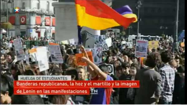 “Ni de derechas ni de izquierdas defienden los estudiantes en sus protestas. Pero las imágenes de los tres últimos días de las manifestaciones convocadas por su sindicato no dicen lo mismo. Abanderando las marchas colores rojos con hoz y martillo. Banderas republicanas o incluso la imagen de Lenin convertido en símbolo. El mismo Lenin que instauro el régimen soviético más criminal y que más víctimas ha provocado de la historia (con imágenes en blanco y negro de Lenin en un desfile del ejército soviético). En la web del sindicato de estudiantes como encabezado: la lucha es el único camino. El sindicato de estudiantes nace 20 años atrás. Se estrenó con las manifestaciones del curso 86-87 la imagen que marcó esta época la del apodado “cojo manteca” y su muleta implacable (con imagen del cojo aporreando con su con muleta)”