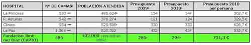· El presupuesto del H. P. de Asturias (Alcalá de Henares) con un número de camas y de habitantes similar, recibe menos de la mitad de lo que se paga a la F. Jiménez Díaz.