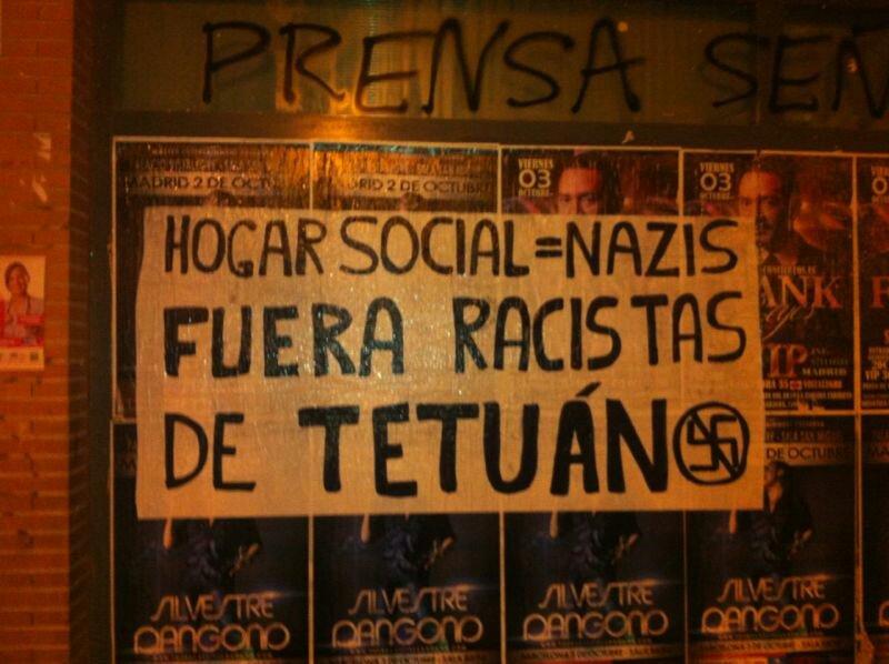 Las acciones de denuncia por el centro fascista Hogar Social que se ha instalado en Tetuán continuan. Hoy Tetuán amaneció con grandes carteles que denuncian que el racismo no es bienvenido en el barrio. El colectivo antifascista "Algarada" informa a través de su cuenta de Twitter que jóvenes del barrio realizaron la acción para dejar claro que"en este barrio no se les quiere".
