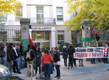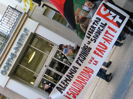 Este sábado 19 de diciembre, y pese a la premura de la convocatoria, decenas de afiliados a la CNT madrileña se han concentrado ante el Instituto de Cultura y la embajada alemana para denunciar la situación de acoso contra los trabajadores y trabajadoras de la FAU-AIT.