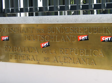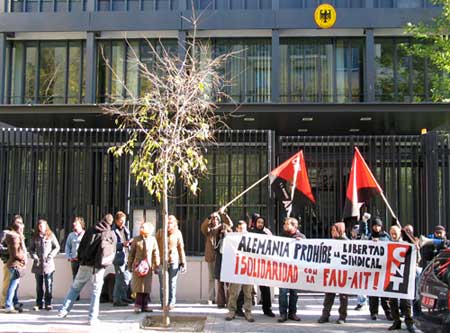 Como respuesta a la llamada internacional de solidaridad de la FAU-AIT, que había preparado un acto urgente el día 19 en Berlín para denunciar la sentencia que les prohíbe ejercer la labor sindical bajo fuertes penas económicas, el sindicato de Artes Gráficas, Comunicación y Espectáculos convocaba al resto de la Federación Local de Madrid de CNT a concentrarse frente a ambos organismos y demostrar así que la solidaridad no conoce fronteras para los miembros de la internacional, AIT.