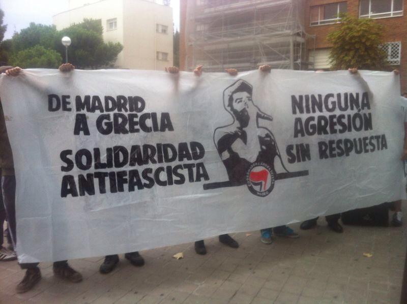 La Coordinadora Antifascista de Madrid convocó la concentración frente a la embajada de Grecia denunciando que "un año después del asesinato de Pavlos a manos de un miembro de Amanecer Dorado, este partido político neonazi continúan teniendo presencia en el Parlamento Griego y Europeo mientras amedrenta a la clase obrera griega con agresiones, encarcelamientos, asesinatos,... Todo esto gozando de una impunidad innegable por parte de la burguesía internacional".