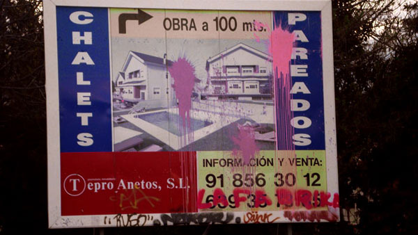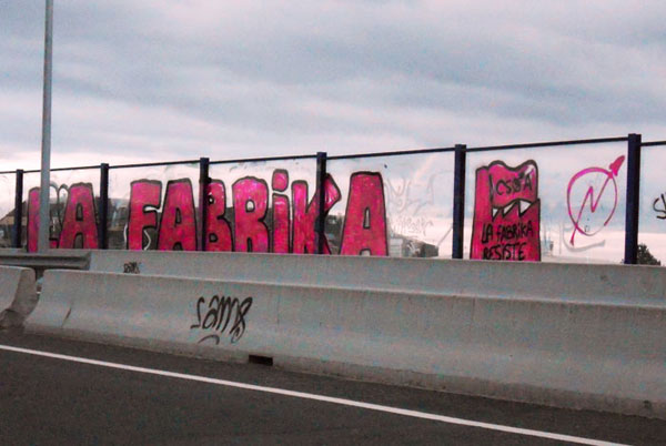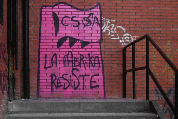 LF.- Pensamos que La Fábrika es inabortable. Este proyecto ha nacido y ya no puede desaparecer. Pero creemos que buena parte del proceso que estamos llevando a cabo tiene que ver con el uso de los espacios fisicos que existen y de las actividades que hay en marcha dentro del centro social. Es decir, tememos que sin este espacio físico muchos de los lazos se pierdan. Por ello se ha apostado porque en Villalba siempre va a haber un centro social okupado, sea el actual u otro. Y en este periódo de transición lo que se ha organizado es una gran campaña de “Guerrilla artística”, de la que puede participar quien quiera aceptando unas bases. Esta campaña tiene el rosa como color, como firma “La Fábrika resiste” y el objetivo es tanto visibilizar nuestra resistencia como señalar a los culpables de este desalojo y también de los problemas generales de la sierra, que consideramos que es la clase política y la mafia de la construcción. Por tanto se están haciendo grandes murales de La Fábrika en puentes y autopistas. Se están haciendo pegatinas, camisetas, pañuelos para colgar de las ventanas, etc. Se están bombardeando con pintura carteles relacionados con la especulación, las elecciones o el llamado “Plan E”. Y lo único que se pide a las personas que se quieran unir es que respeten el pequeño comercio, los coches particulares, etc, es decir todas pequeñas propiedades de la clase trabajadora en general. Y que no se ponga en riesgo la integridad de ningún ser vivo, sean personas o animales.