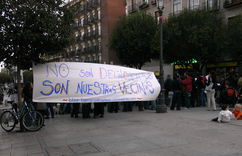 Hace una semana una macro redada de la policía nacional y municipal que se saldó con más de una veintena de inmigrantes detenidos, motivó la protesta espontánea de los viandantes que intentaron parar las detenciones. Ayer, a una semana de aquella espontaneidad, vecinos y activistas se organizaron para responder a las frecuentes redadas racistas que son llevadas a cabo en los barrios madrileños con un alto índice de población inmigrante. Alrededor de las 19.15 horas entre 150-200 personas se concentraron en la mestiza plaza de Lavapiés para denunciar el racismo. Los manifestantes portaron pancartas en las que se leía "Ningún vecino/a desaparecido/a!" o "No son delincuentes, son nuestros/as vecinos/as", esta última firmada por barrios sin fronteras. Durante la misma se corearon gritos de " "ningún ser humano es ilegal" y "fuera policía de nuestros barrios", contando la movilización con presencia vecinal. Una hora más tarde se daba por finalizada la protesta en la cual no hubo presencia policial.