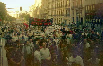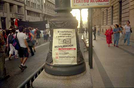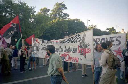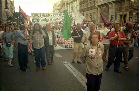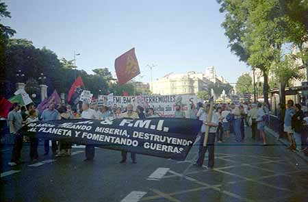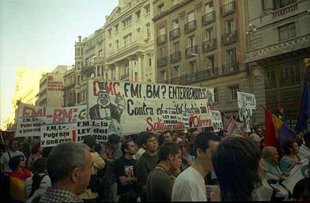 20.45: Pasadas las 20.30 ha dado comienzo la manifestación, formada por unas 1.000 personas, que ha avanzado unos metros por la calle Alcalá. La pancarta de cabecera es de Corriente Roja de Izquierda Unida, cuyo lema denuncia "FMI y BM, cumbre de ladrones, ¡que se vayan de aquí!". Otra llamativa pancarta de Ecologistas en Acción señala "FMI y BM, 600 años dándonos destruccion y miseria". También se observan banderolas castellanas, de CNT y Solidaridad Obrera. La manifestación, que en estos momentos lanza gritos de "el capitalismo humanitario es el cuento del Fondo Monetario", se encuentra totalmente acordonada por la policía antidisturbios.