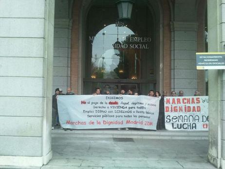 diversos colectivos de las Marchas de la Dignidad, hemos dado comienzo a la Semana de Lucha Social en Madrid, con la ocupación de un Centro del INEM. Un numeroso grupo de compañeros y compañeras ha entrado en el edificio repartiendo octavillas y gritando “La lucha es el único camino”, “Contra el paro lucha obrera”. Una vez explicado a lxs empleadxs públicxs nuestra voluntad exclusivamente reivindicativa y a las personas paradas allí presentes la inexcusable necesidad de afrontar con voluntad de combate a quienes pretenden destruirnos, un compañero ha leido el Manifiesto que se cita más abajo, entre los aplausos de lxs asistentes.